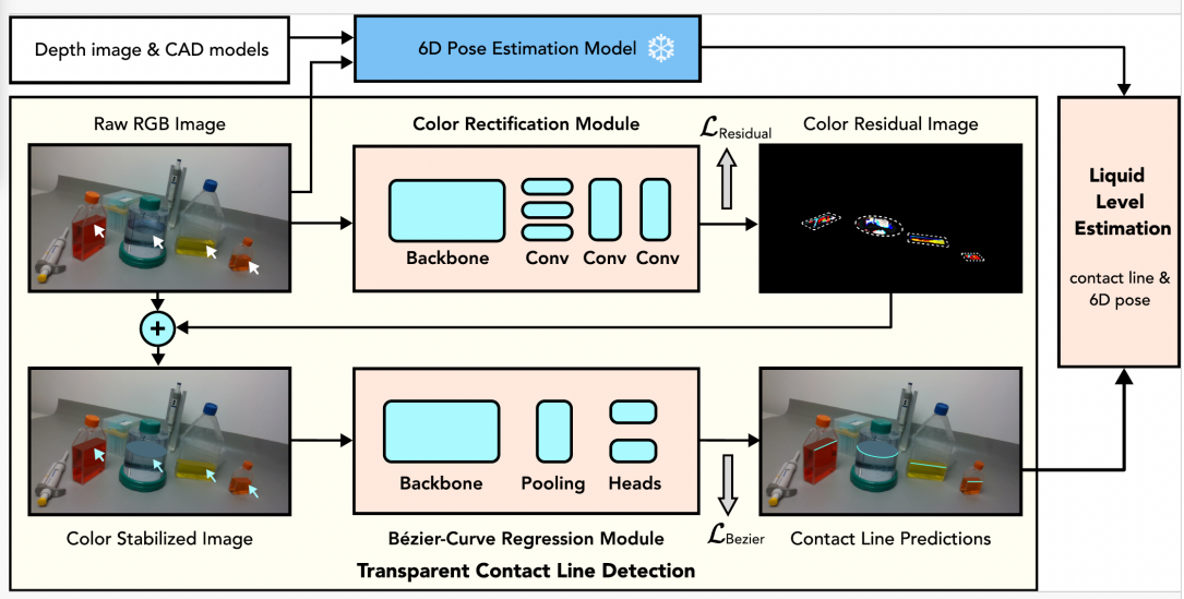论文Towards Dual Transparent Liquid Level Estimation in Biomedical Lab: Dataset, Methods and Practices被计算机视觉顶会ECCV2024接收,主要内容为:在AI赋能的智能生物医学实验室中,准确估计容器内透明液体的高度对于液体分配、吸取和混合等实验任务至关重要。现有方法仅关注固定视角下的单个实例,与实际应用场景有较大差距。为此,夏天教授团队提出了一种新的双透明液位高度估计Benchmark,包括数据集、方法和实践,提出的DTLD (Dual Transparent Liquid Level Estimation Dataset) 数据集包含27,458张图片,涵盖四种透明生物医学实验器皿,涉及多个视角。基于DTLD,团队提出了一种端到端的学习方法来检测液位接触线(Contact Line)并估计液位。为提高检测鲁棒性,还提出了一个液面修正模块。实验证明,此方法将液位估计的平均绝对百分比误差减少了43.4%。