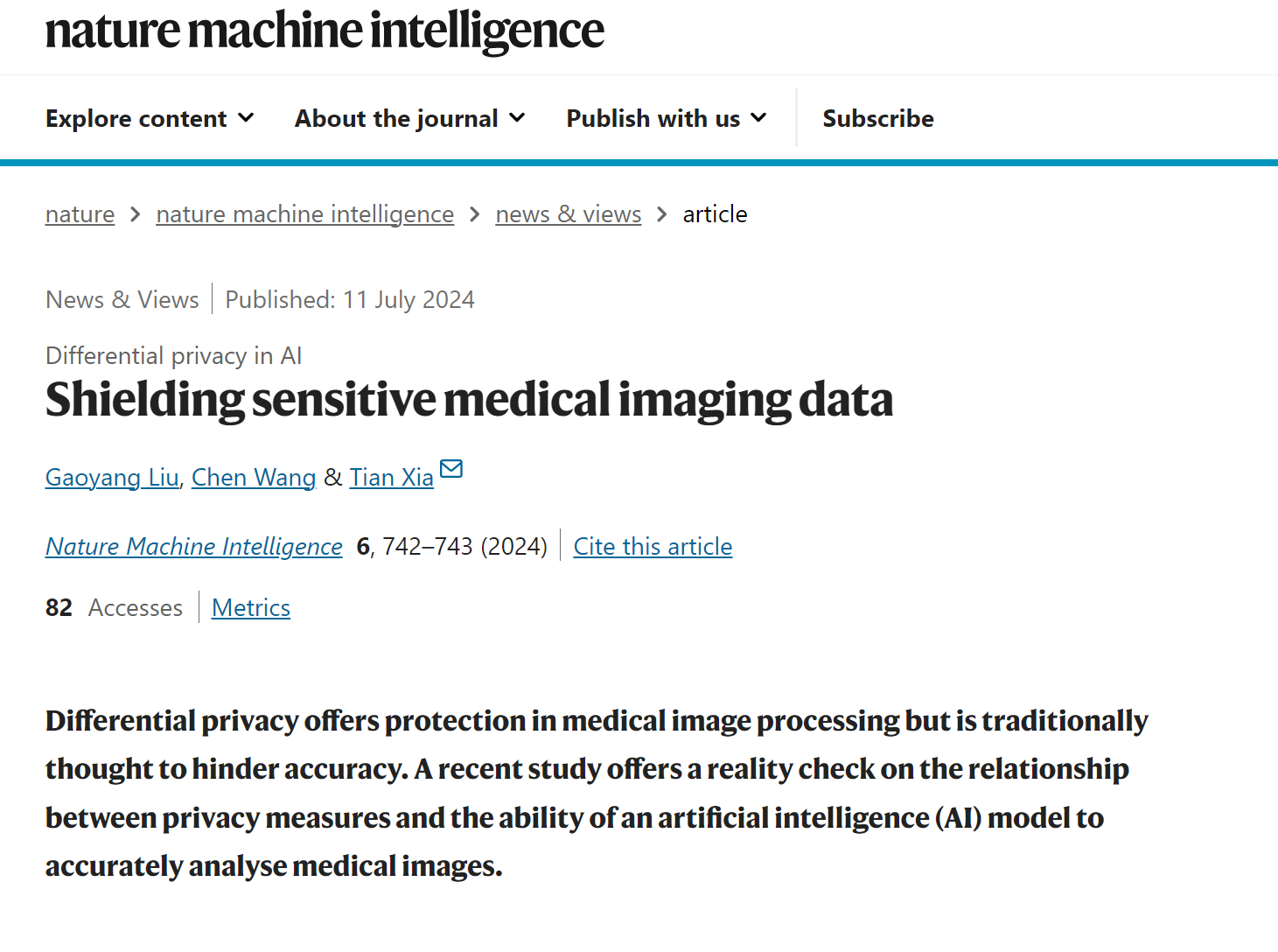 论文Shielding sensitive medical imaging data于7月11日发表在国际人工智能领域顶级期刊《自然》子刊Nature Machine Intelligence。随着人工智能在医疗影像分析中的广泛应用,其在疾病诊断和患者预后预测方面发挥着革命性作用。然而,患者隐私保护问题也日益凸显并受到广泛关注。差分隐私技术作为保护数据隐私的有效手段,传统上被认为会牺牲人工智能模型的性能来换取数据隐私的安全。夏天教授团队受Nature Machine Intelligence主编邀请,发表文章论述差分隐私技术的基本概念,评述在大规模数据集上应用差分隐私最新技术突破:在不显著影响AI模型性能的前提下,有效保护用户数据隐私。此项技术挑战了隐私保护与模型性能不可兼得的传统观念,为差分隐私技术在AI领域的应用提供了新的视角和可能性。