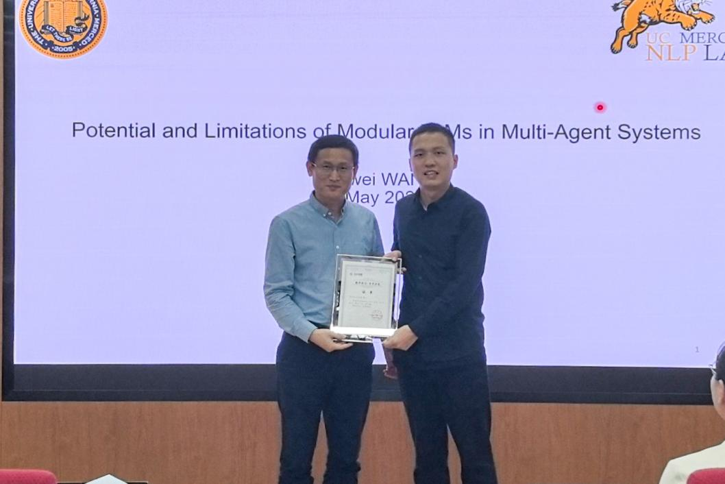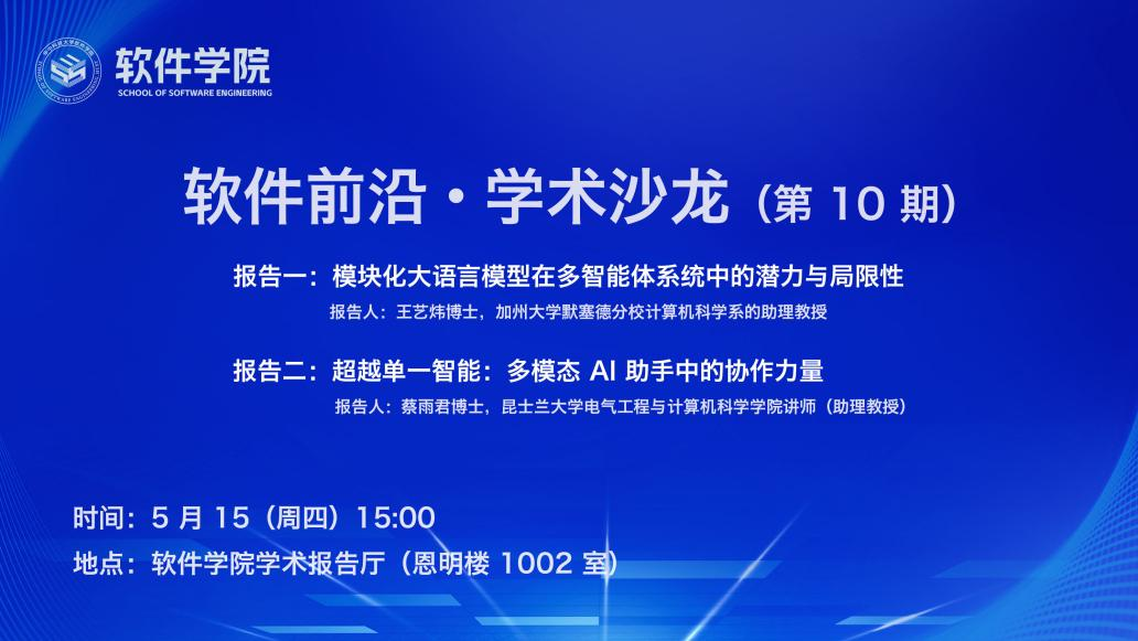 2025年5月15日下午,“软件前沿·学术沙龙”第十期在学院1002学术报告厅圆满举行。本期活动以“人工智能前沿技术”为主题,特邀加州大学默塞德分校计算机科学系助理教授王艺炜博士和昆士兰大学电气工程与计算机科学学院助理教授蔡雨君博士担任主讲嘉宾,展开深度分享。活动由william威廉中文院长助理郭连波教授主持,吸引了众多师生参与,现场学术氛围浓厚。