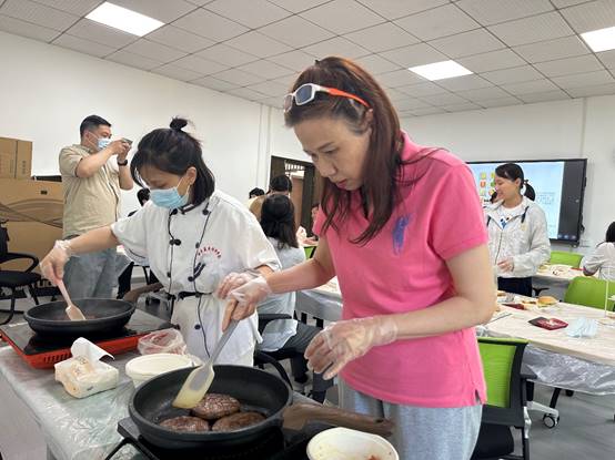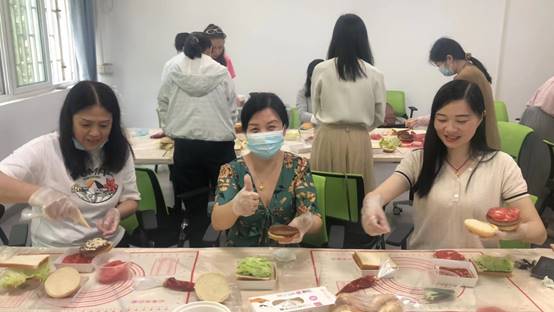 随着时间的推移,一个又一个美味的三明治诞生了,老师们互相品尝,交流彼此的创意和口感,不时发出惊叹和赞美之声。接下来是汉堡的制作,老师们更加得心应手。有的人把自己的三明治做法和汉堡制作融合在了一起,有的则选择了新的食材和调味品来尝试。现场的气氛变得更加热闹,大家都在展示自己的创意和厨艺。