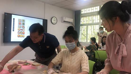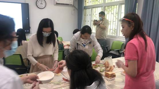 下午一点半,两位高级厨艺师早早到达活动现场,精心布置,另严肃简洁的会议室瞬间变身为充满生活气息的精致厨房。下午两点五十分,老师们陆续到达。经验丰富的专业美食老师先为大家介绍了三明治的起源和发展,并具体讲解制作三明治和汉堡的技巧和方法。在专业老师的指导下,老师们踊跃参与,开始了自己的第一道菜——三明治。每个老师都有着自己的独特创意,比如用奶酪搭配生菜、番茄和火腿肠,或是用牛肉片和香菇拌在一起。他们快速地在桌子上展开了自己的“制作车间”,有的人专心致志地切着食材,有的则把注意力放在了调味品上,而其他人则交流着彼此的经验和技巧。