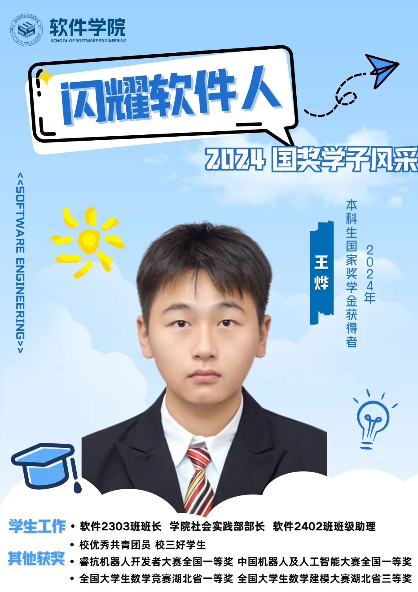王烨:担任软件2303班班长、安全员,现任社会实践部的部长、软件2402班班级助理