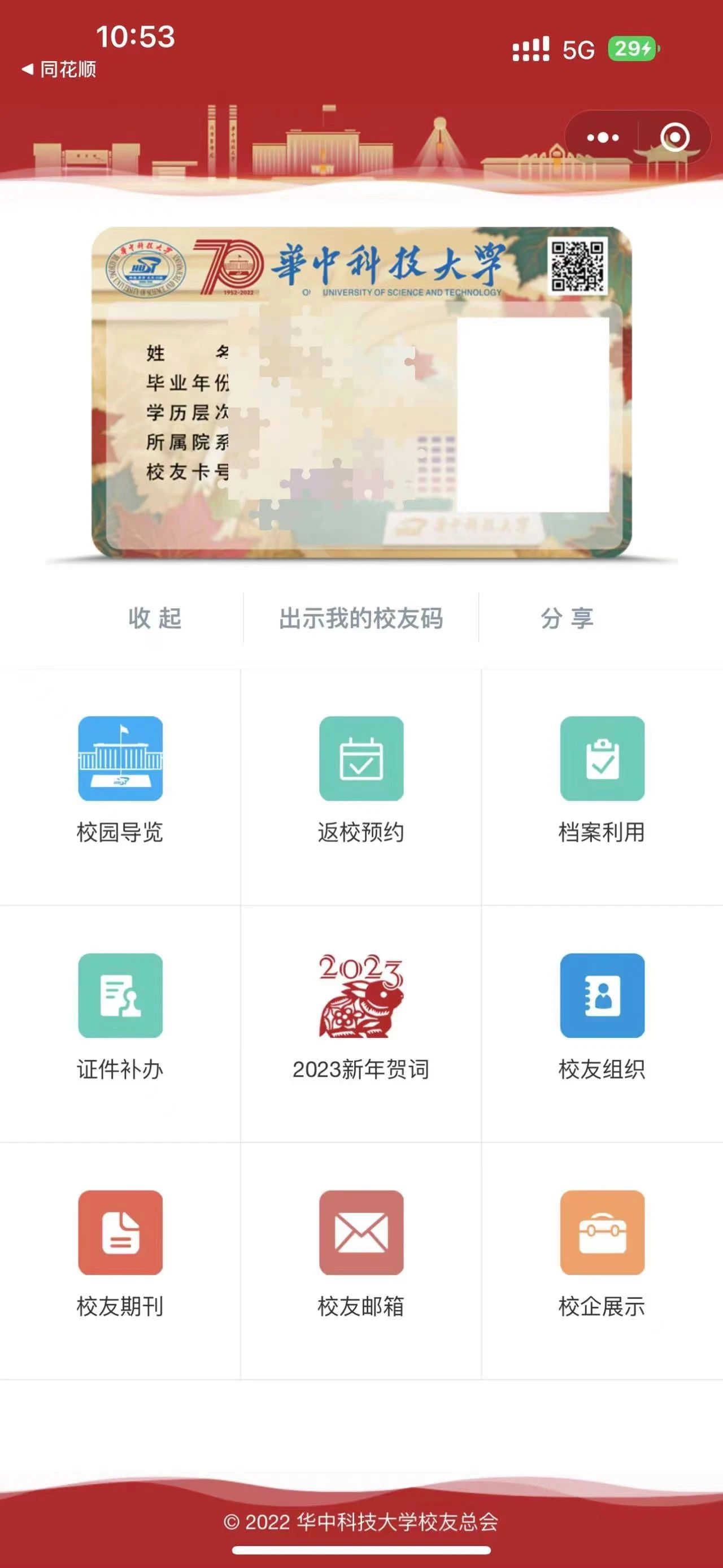 校友若未申领校友卡,请先通过”华科大校友“微信小程序注册并进行校友身份认证和校友卡认领,再进行返校预约。