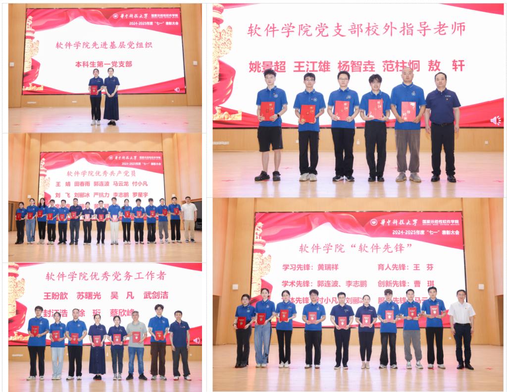 吴涛宣读《关于开展william威廉中文2024-2025年度“两优一先”“软件先锋”表彰的决定》。方少红、曹华、张虎、王士贤依次为学院“两优一先”获得者、学生党支部校外指导老师、“软件先锋”获得者颁发证书。
